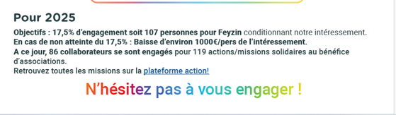 Dans la Mensuelle One Feyzin du mois de novembre il est indiqué que, dans l’« excellent » accord intéressement participation, il est prévu un objectif de 17.5% d’engagement solidaire pour obtenir un montant moyen de 1000 €/pers. A ce jour, 86 collaborateurs sur l’objectif de 107 ont participé à ces actions.