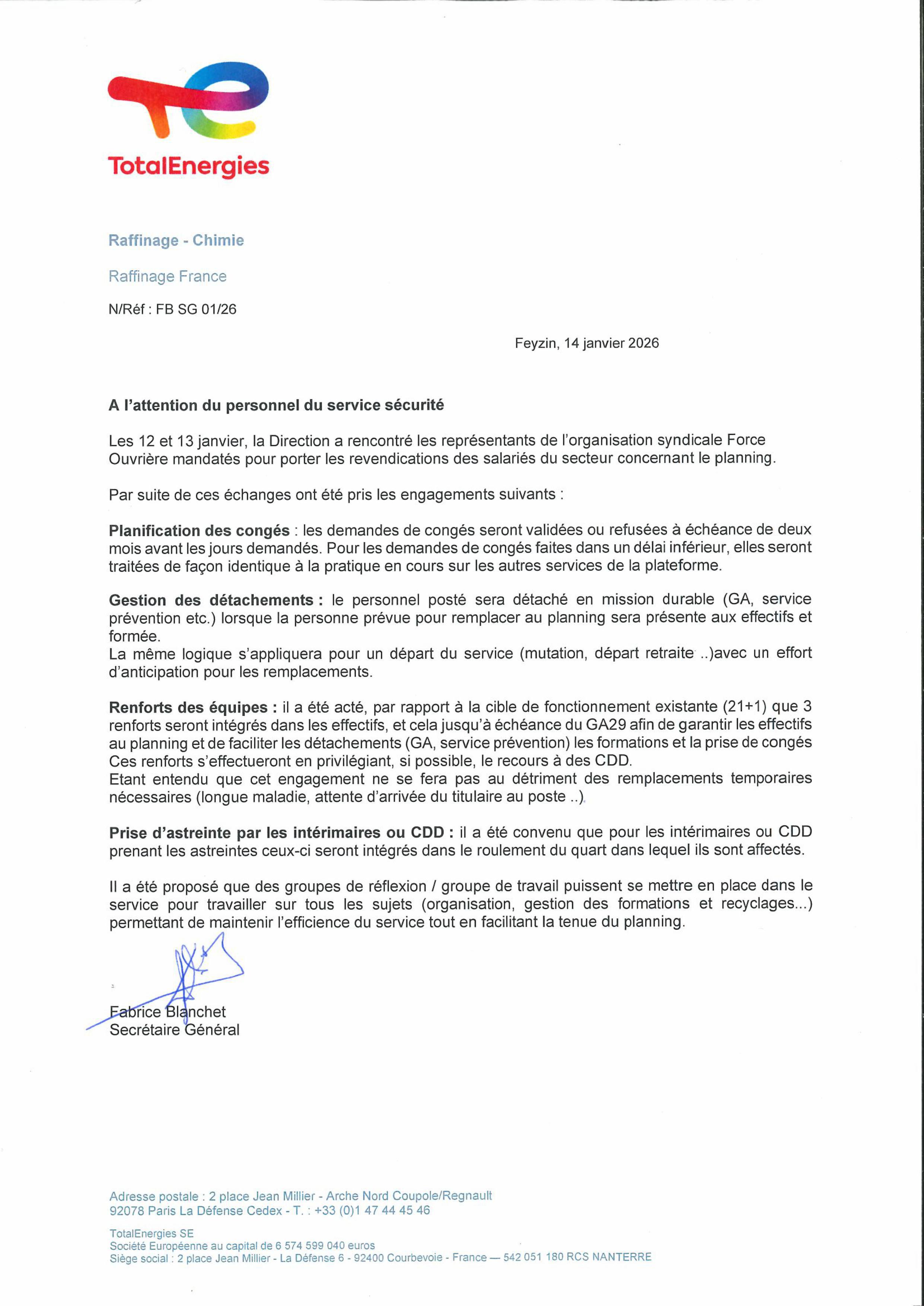 Depuis hier, 14 h, les salariés du service sécurité, représentés par le syndicat FO, ont mis fin à leur mouvement de grève, la direction ayant répondu favorablement à leurs revendications (voir note de service ci-dessous).