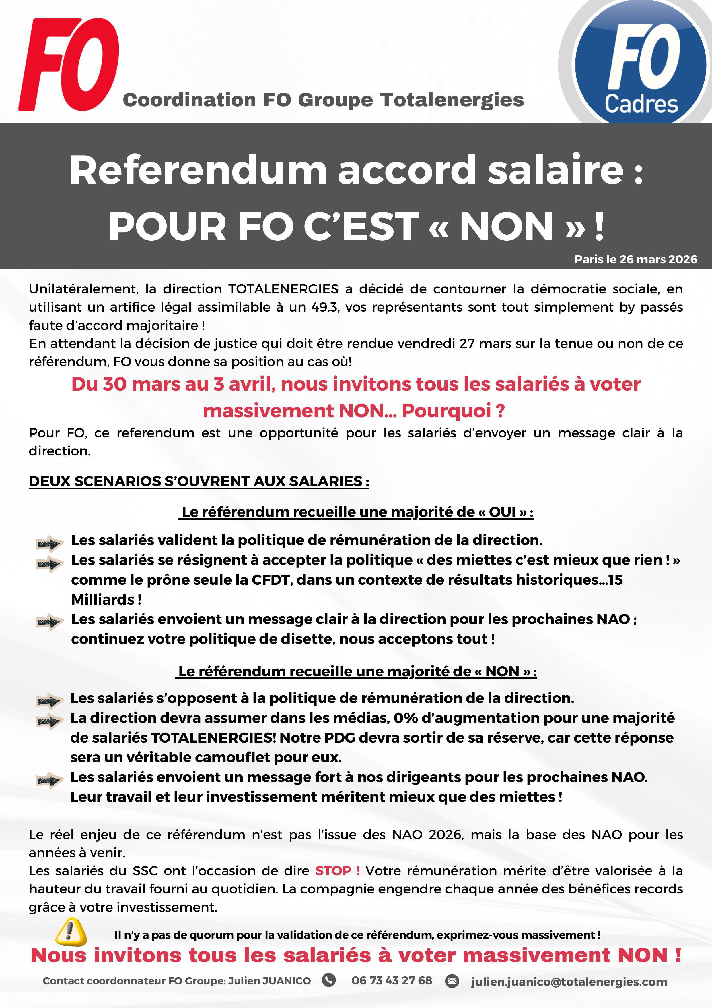 👉​ Vendredi 27 Mars 2026, le tribunal de Nanterre s’est déclaré incompétent pour statuer sur l’assignation CGT, soutenue par FO et SICTAME contre TOTALENERGIES visant l’interdiction du référendum « NAO ».