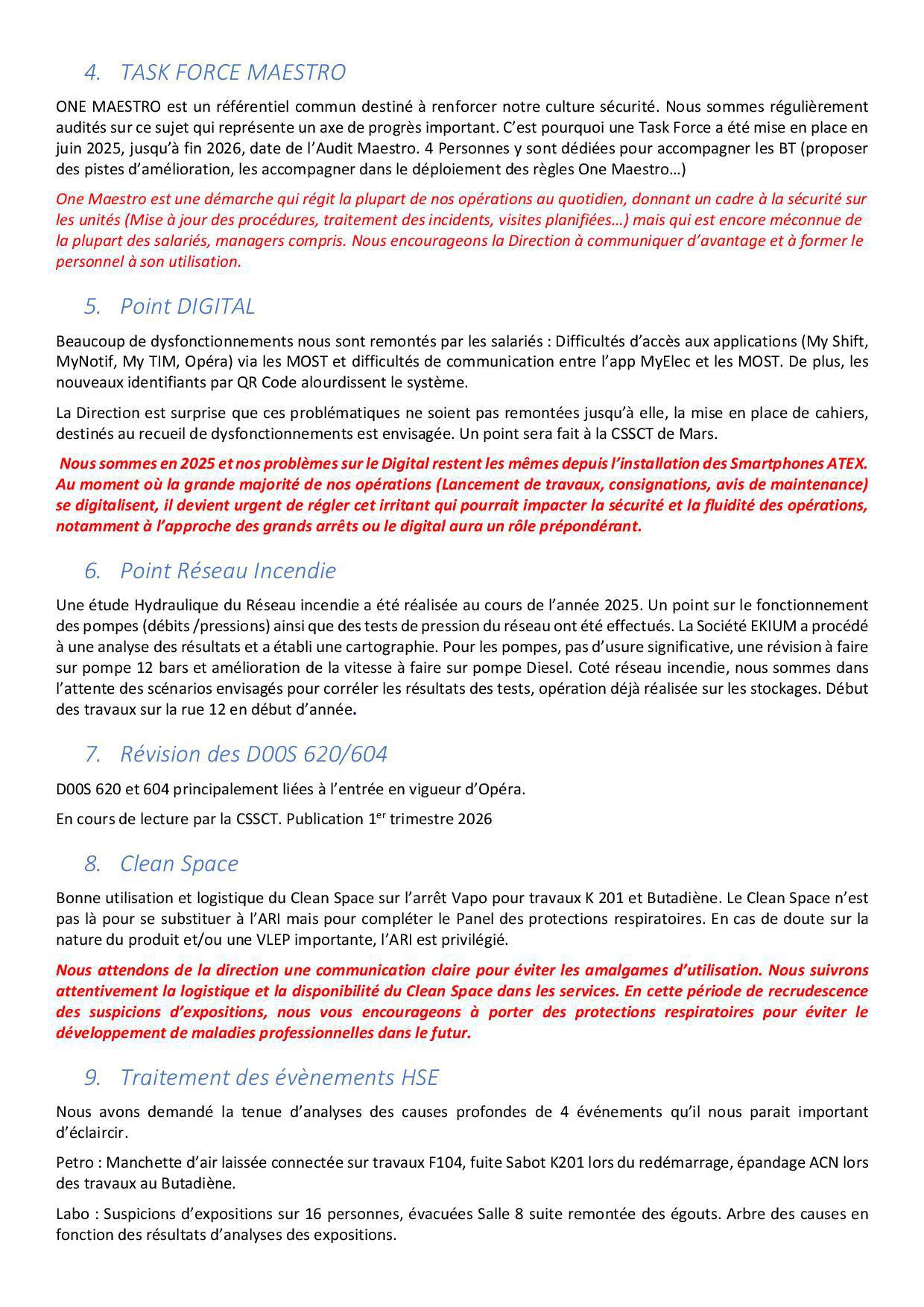 Prochains CSSCT le 27 janvier 2026 (avec les entreprises extèrieurs) et le 24 mars 2026.